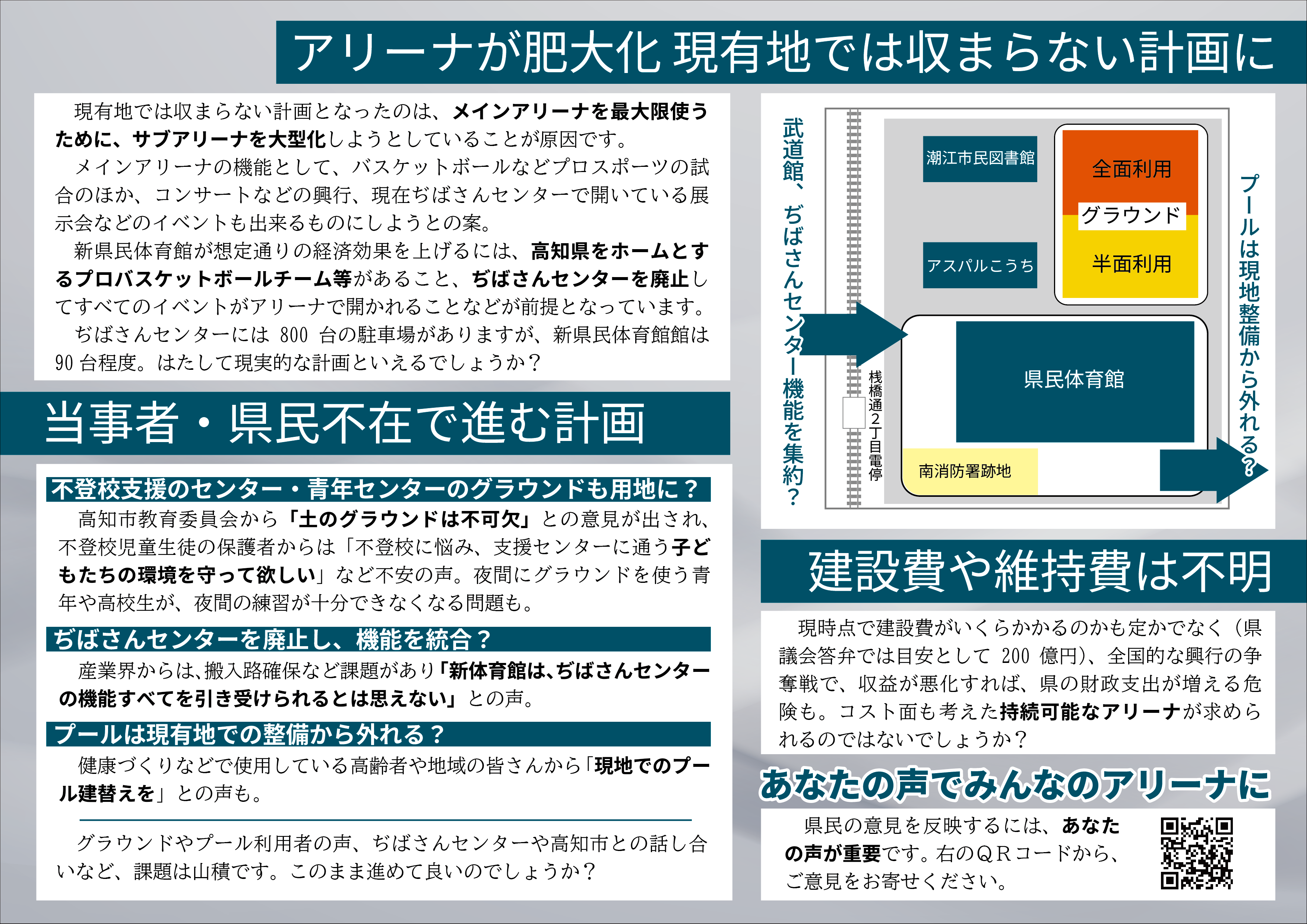 県民・市民みんなのためのアリーナにするため、何が必要でしょうか。県民の皆さんといっしょに考えるため、チラシをつくりました。